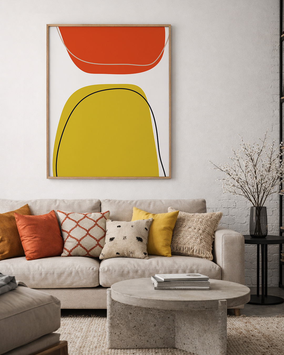 Esta lámina abstracta moderna se compone de formas orgánicas y colores cálidos como amarillo y terracota, creando una pieza vibrante y expresiva. El diseño transmite movimiento y energía visual.