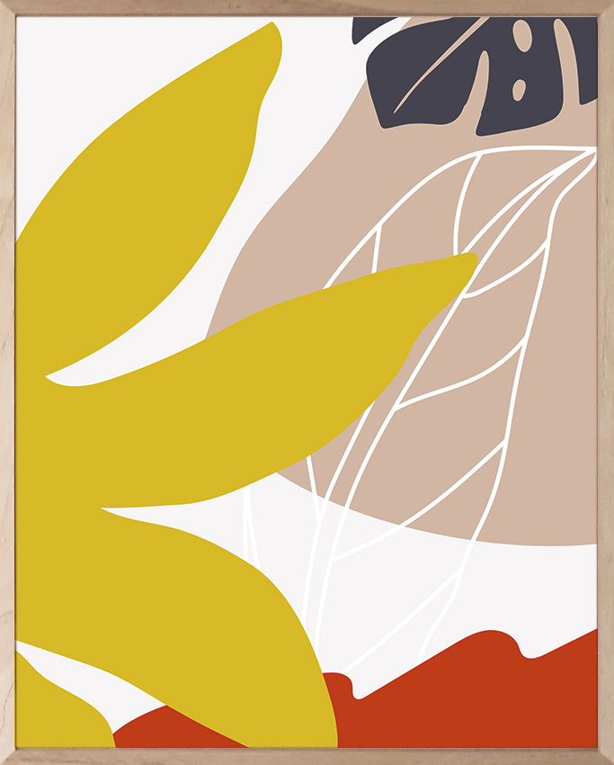 Esta lámina botánica moderna presenta hojas estilizadas con un diseño actual y una paleta en tonos mostaza, beige y tierra. Su estilo gráfico es limpio y contemporáneo, ideal para sumar naturaleza de forma sutil.