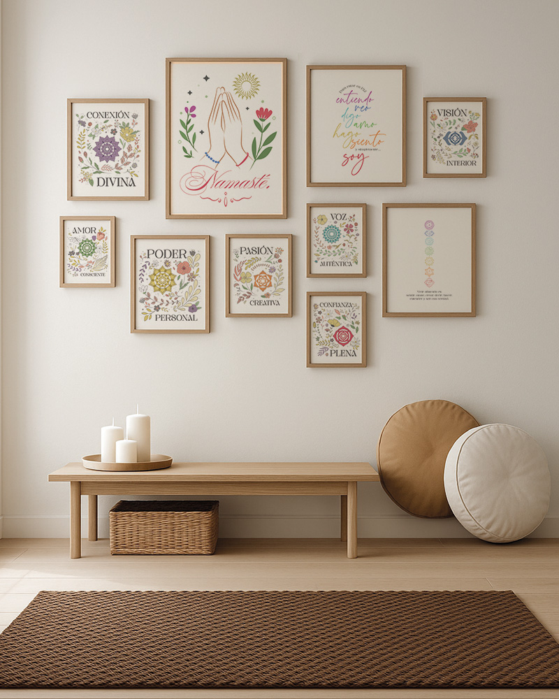 Ideal para quienes practican yoga, meditación o desean transformar su hogar en un refugio de energía positiva, este set aporta identidad, propósito y serenidad a cualquier ambiente. Podés utilizarlo completo para crear una pared temática o distribuir cada pieza en diferentes rincones, acompañando tus rituales diarios y tu camino de crecimiento personal con mensajes que elevan, alinean y sostienen.