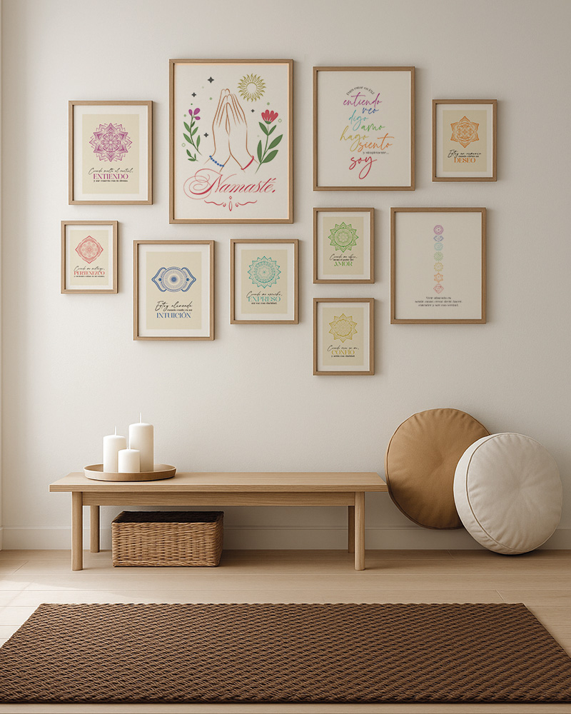 Es el set ideal para crear una pared llena de propósito en tu espacio de meditación, yoga, dormitorio u oficina, aportando calma, belleza y sentido espiritual. Podés usar las diez láminas juntas para un impacto visual armónico o distribuirlas en diferentes rincones, acompañando tus rituales diarios y tu camino de crecimiento personal con arte que eleva, centra y transforma.
