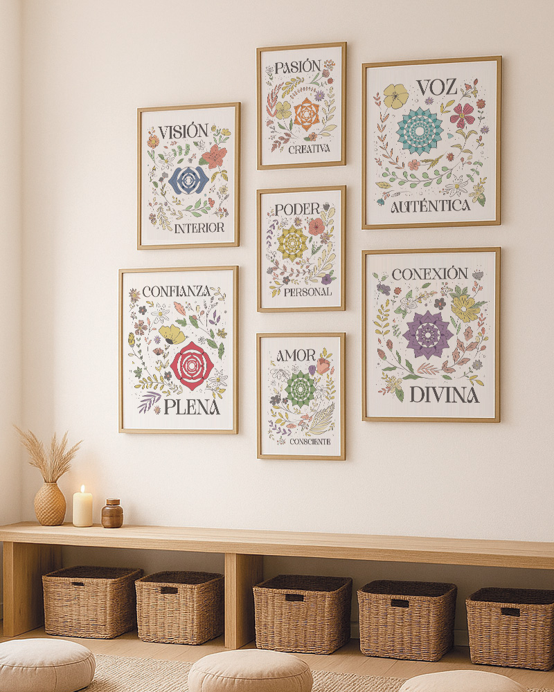 Los siete chakras funcionan como un mapa interno que guía la vitalidad, la claridad, la creatividad y la presencia consciente. Este set láminas chakras ofrece una representación completa de ese flujo energético, integrando estilo contemporáneo con simbolismo espiritual. Perfecto para acompañar prácticas de meditación, rutinas de bienestar o simplemente para embellecer ambientes con una energía elevada y coherente.