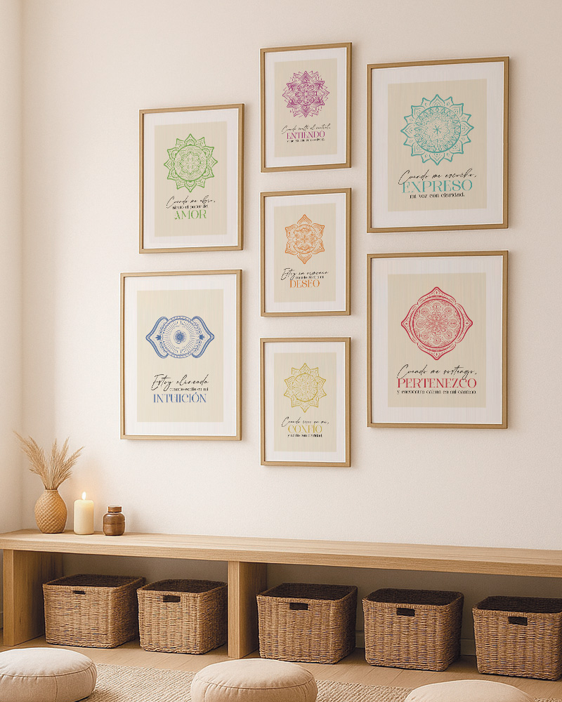 La serie completa está diseñada para acompañarte en un recorrido energético que va desde el enraizamiento y la seguridad, hasta la intuición, la expansión espiritual y la conexión divina. Al colocarlas juntas o por separado, estas láminas transforman el ambiente con calma, presencia y coherencia visual. Son una propuesta ideal para estudios de yoga, rincones de meditación, consultorios terapéuticos, dormitorios y espacios personales dedicados al bienestar y la introspección consciente.